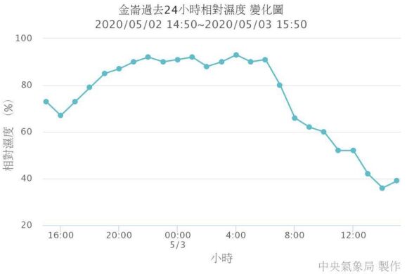 20. 下圖為位於臺東市以南的金崙地區,在 2020 年 5 月 2-3 日的溼度變化圖。在 5 月 3 日 當天,該地最可能出現下列哪種天氣現象? (A)半夜以前有冷空氣南下 (B)下午兩點的溫度達到最低 (C)早上六點東北風開始增強 (D)中午以前開始出現焚風現象