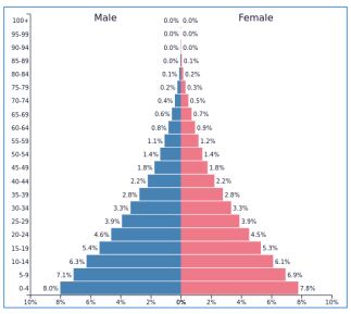 24. 下圖是世界某個地區的人口金字塔圖,單從圖中人口結構來研判,下列何者最可能是該地區採取的人口政策? (A)倡導晚結婚晚生育觀念 (B)積極推動生育獎勵政策 (C)提高老人福利津貼補助 (D)延長公務人員退休年紀