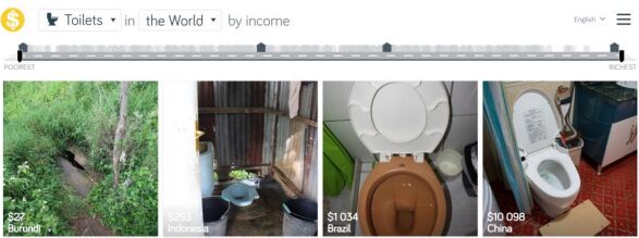 40. 下圖是摘錄自 DOLLAR STREET 網站,目前世界各國馬桶或便器樣式的一些案例,照片左下角為便器價格與國名。該圖最可能可反映出下列哪項事實? (A)如廁文化改變 (B)全球經濟發展不均 (C)氣候影響廁所構造 (D)價格與廁所環境呈反比