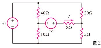 3. 如圖2所示,若vs1 = 200 V,vs2 = 40 V。請問流經8 電阻的電流I應為何?(A)0.5 A(B)1 A (C)2 A (D)4 A。