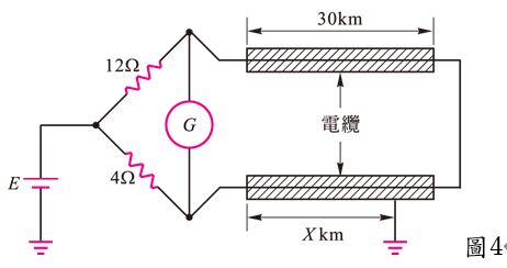 7. 如圖4所示,以惠斯登電橋測量電纜接地故障,當G不偏轉時,求故障點之距離X為何?(A)10 km(B)15 km (C)20 km (D)25 km。