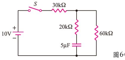 10. 如圖6所示,開關 閉合時的充電時間常數為多少秒? (A)0.1秒(B)) 0.2秒 (C)0.4秒 (D)0.8秒。