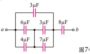 11. 如圖7所示,求a,b間之等值電容量為多少? (A)4μF(B)6μF (C)8μF (D)10μF。