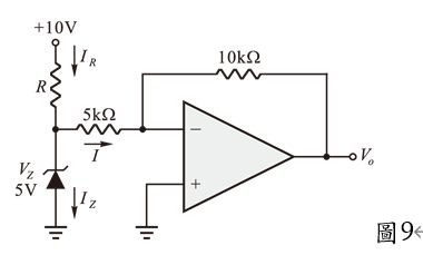 17. 如圖9所示之理想運算放大器電路,若流經稽納二極體之電流IZ=1.5mA,運算放大器之飽和電壓為±15V,則R值為多少? (A)0.5 kΩ(B)1 kΩ (C)2 kΩ (D)3 kΩ。