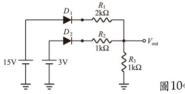18. 如圖10所示之電路,若二極體為理想二極體,則Vout為多少? (A)1.5 V(B)5 V (C)5.6 V (D)10 V。