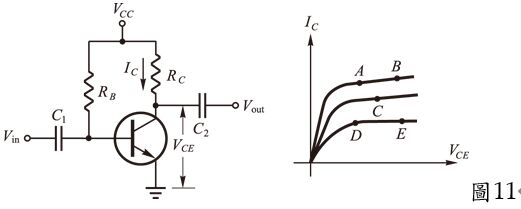 19. 如圖11所示之電路及電晶體之特性曲線,若原工作點在E位置,欲修正工作點至C位置,則應如何? (A)減少RB (B)增加RB (C)減少RC (D)增加RC。