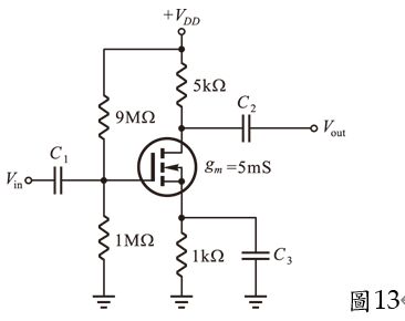 21. 如圖13所示之電路,若場效電晶體操作在定電流區,則電壓增益約為多少? (A)-5(B)5 (C)-25 Ω(D)25Ω。