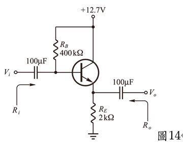 23. 如圖14所示之電路,若矽電晶體的β = 50,則輸入電阻Ri約為多少? (A)2 kΩ(B)80 kΩ (C)133 kΩ (D)400 kΩ。