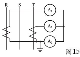 44. 如圖15所示,電流表A2指示之電流為 (A)無法判斷(B)T相 (C)R相 (D)S相。