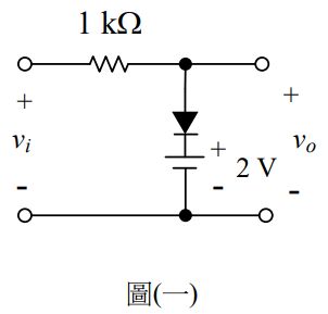 3.如圖(一)所示之二極體電路,假設二極體順向導通電壓為0.7V,輸入電壓vi為1kHz,±10V之方波,則輸出電壓vo之平均值為何?