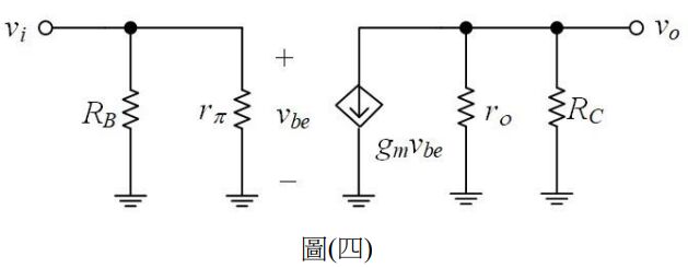 9.如圖(四)所示為一共射極(CE)放大器之小信號等效電路,求此電路之電壓增益AV為何?