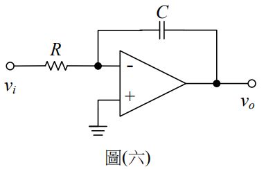 11.如圖(六)所示為一理想運算放大器(OPA)電路,假設R=2kΩ,C=1μF,輸入電壓vi為1kHz,±10V之方波,且電容器初始電壓為0V,求輸出電壓vo的最大值為何?