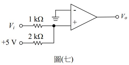12.如圖(七)所示為一運算放大器(OPA)比較電路,已知OPA之輸出飽和電壓為±13V,則當vi=-2V和vi=-3V時,其相對應之輸出電壓vo為何?
