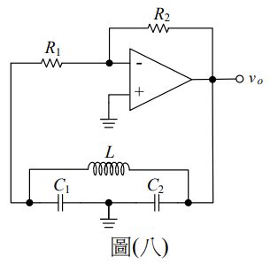 13.如圖(八)所示之考畢子(Colpitts)振盪電路,假設R1=10kΩ,R2=20kΩ,L=0.5mH,C1=60pF,且C2=30pF。求此電路之振盪頻率為何?