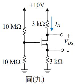 17.如圖(九)所示為一N通道增強型MOSFET放大電路,假設臨界電壓VGS(t)=1V,參數k=1mA/V²,求直流工作點ID和VDS分別為何?