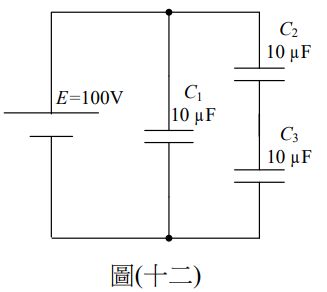25.如圖(十二)電路所示,求總電容量及通過C2之電量為何?