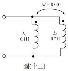 27.如圖(十三)電路所示,若L1=0.1H,L2=0.2H,互感量M=0.001,求總電感量為何?