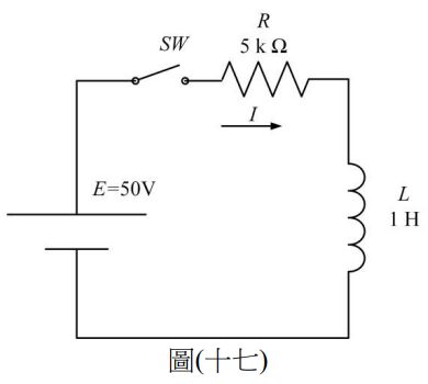 32.如圖(十七)電路所示,若在t=0時將開關閉合,試求經過多少時間後電流達到穩態?
