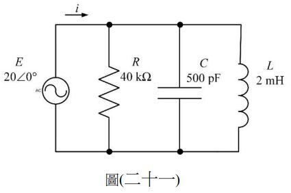 38.一個RLC並聯交流電路如圖(二十一)所示,當此電路產生諧振時,諧振頻率為何?
