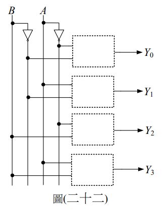 47.若欲設計一個2對4線解碼器,試問如圖(二十二)之電路虛線處應使用何種邏輯閘?