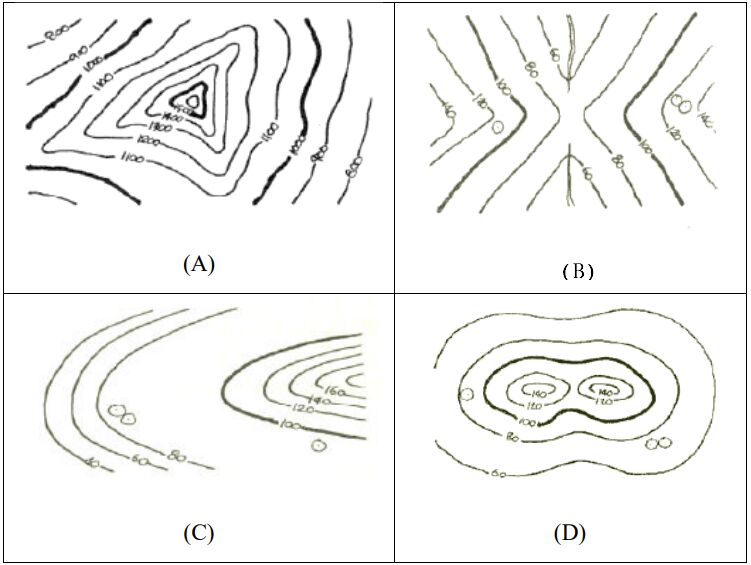 下列等高線地形圖中,哪一張圖的中央位置是該圖中的最低點? (A) A (B) B (C) C (D) D