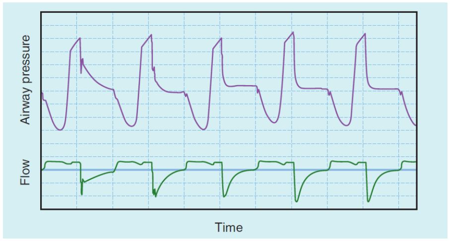 (A) 呼吸器設定使用 constant flow rate 設定的 inspiratory flow rate 不足。 (B) 病人發生了 auto-PEEP,導致吸氣 trigger 費力。 (C) 病人使用 pressure control ventilation (PCV) mode 的壓力設定偏低,導致吸氣 trigger 費力。 (D) 病人呼吸管路有痰液,導致 flow-to-time 圖形發生震盪現象。