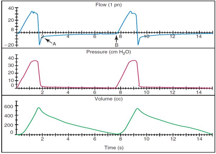 73. 當病人於使用呼吸器過程中發生下圖情況並造成血氧飽和度下降,請問以下敘述何者有 誤?(A) 發生了 auto-PEEP 問題 (B) 病人有 bronchospasm 造成吐氣氣流限制(airflow limitation) (C) 呼吸器的吸氣 trigger 設定不良 (D) 減少吸氣潮氣容積可以減少 auto-PEEP 的發生