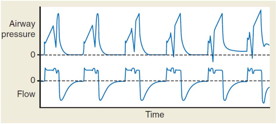 72. 當慢性阻塞性肺病患者發生急性惡化合併呼吸衰竭使用呼吸器時,由呼吸器的圖形觀察 到下圖中情形,請問以下敘述何者正確?