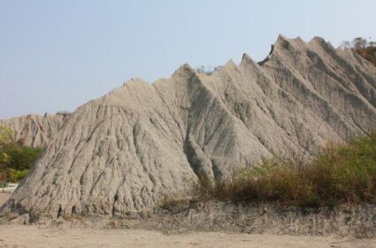 15. 下圖為某地的地形景觀。通常此類地形分布區附近,還可能伴隨下列哪種地形的出現? (A)沙丘 (B)泥火山 (C)蕈狀岩 (D)豆腐岩