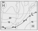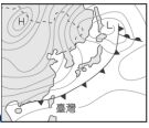 17. 中央氣象局指出:「今天各地仍會因梅雨鋒面帶來的降雨,易有大雨或豪雨的發生,民眾需留意落石及土石流災情,並避免從事山林溪邊活動。」下列哪個天氣圖最符合上述的天氣預報內容? (A)(B)(C)(D)
