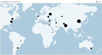 33. 下圖是2020年某種作物的全球產量分布圖,圓形符號愈大,代表該國產量愈多(圓形符號標示在該國首都的位置)。該作物最可能為下列何者? (A)小麥 (B)稻米 (C)茶葉 (D)咖啡