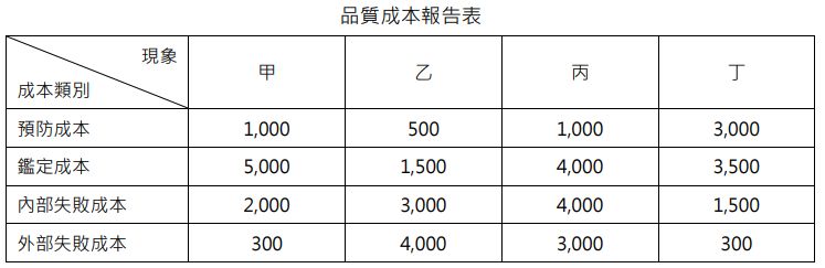 5. 四家食品工廠之品質成本的報告表中,哪一種現象最像是一家持續推行多項成功的改善活動,且製程十分穩定之公司的情形?