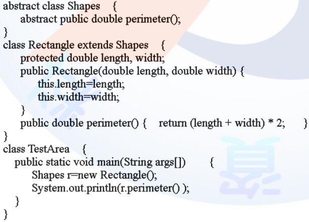 5. 以下 Java 程式執行完後,輸出結果為何?(A)無法編譯,因為 Rectangle 類別沒有預設建構子(B)0.0(C)無法編譯,因為 Shapes 類別設定為 abstract 而無法產生 Rectangle 物件(D)無法編譯,因為 Shapes 物件不是 Rectangle 類別。
