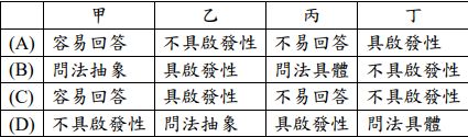 生活中的問題大致分為四大類型,根據上圖內容判斷,甲、乙、丙、丁四處填入下列哪一組選項最恰當?