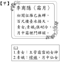 (A)兩詩皆以嬋娟來表示美好的姿容 (B)兩詩皆明白寫出霜月互鬥的結果 (C)乙詩清楚標示季節,甲詩則無法判斷 (D)乙詩寫出霜、月間的對話,甲詩則無