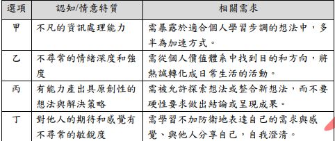 19.關於資優學生認知和情意特質及其可能的相關需求,下列配對哪一個選項最為適切?(A)甲 (B)乙 (C)丙 (D)丁