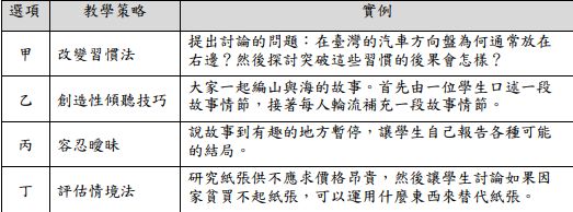 39.蔡老師運用威廉斯(Frank E. Williams)思考和情意教學模式中之教學策略進行教學,以提升資優班學生的認知和情意行為。下列哪些教學策略與實例之配對錯誤?(A)甲 (B)乙 (C)丙 (D)丁