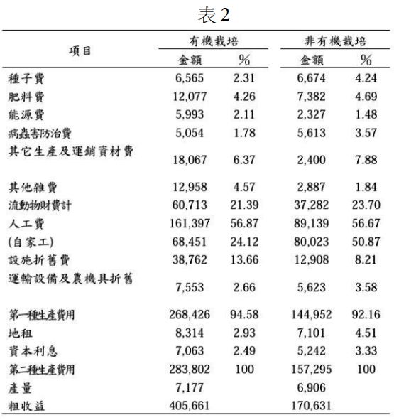 31.表 2 為某年臺灣中部地區有機蔬菜與非有機栽培蔬菜的生產成本分析。其中哪項成本細項,最適合用來 說明有機蔬菜較具有精緻農業的特色?