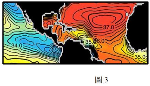 46.圖 3 是東太平洋-北大西洋及其鄰近海域氣候年平均的海洋 表面鹽度(SSS: Sea Surface Salinity)的等值線分佈(單位: psu, practical salinity unit, 1 psu 等於 g/kg)。巴拿馬首都巴拿 馬城在 900hPa 的年平均風向最可能是下列何者? (A)45 度 (B)90 度 (C)135 度 (D)180 度