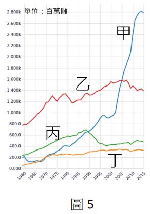 48.圖 5 是四個國家 1960-2015 年間年碳排放量變遷圖 這四個國家若依照美國、俄羅斯、中國、日本的順 序排列,圖中對應的線條排序應為何?