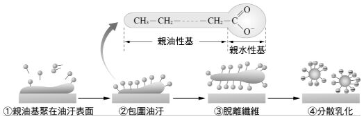 21. 附圖為表示肥皂分子的構造及其去汙原理。在裝水和沙拉油的試管中,加入少許肥皂,搖動後,整個試管中的液體變混濁,油水的界線也不見了,其原因為何?