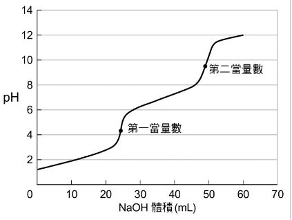 25. 附圖為氫氧化鈉水溶液滴定某種酸的曲線圖,根據圖形的變化,下列哪個選項符合此結果?