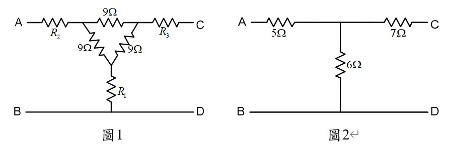 18.如圖1與圖2所示之兩電路互為等效電路,則以下何者正確? (A)R1=2 Ω (B)R2=3 Ω (C)R3=4 Ω (D)以上皆是。