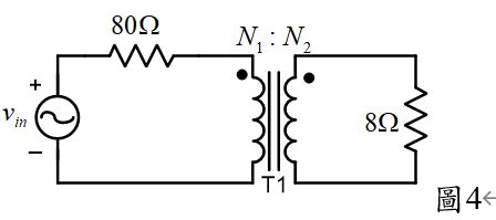 24.圖4電路中之T1為理想變壓器,且其一次側與二次側圈數分別為N1與N2。若欲使8 Ω電阻獲得最大功率,則為多少? (A) (B) (C)10 (D)。
