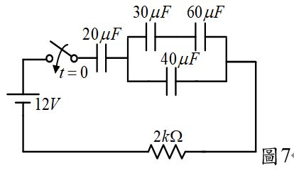 32.如圖7所示,若於t=0秒時,將開關閉合,試問此電路之時間常數為多少? (A)10 (B)20 (C)25 (D)30 ms。