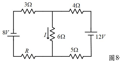33.圖8所示電路,若I=0時,R為多少? (A)2 (B)3 (C)4 (D)5 Ω。