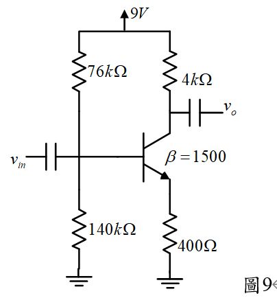 41.圖9之電晶體電路,其電壓增益約為 (A)65 (B)50 (C)25 (D)10。