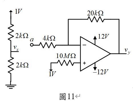 45.圖11所示之電路,若運算放大器的特性是理想的。Vx 之電壓經分壓為0.5 V,若將Vx 之電壓直接以導線接至a點,則Vy 之電壓應為多少? (A)-3.5 (B)3.5 (C)-3 (D)3 V。