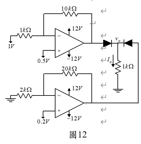47.圖12所示之電路,若運算放大器的特性是理想的,且二極體的順向導通電壓為0.7 V,則Io 應為多少?