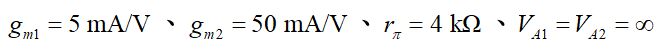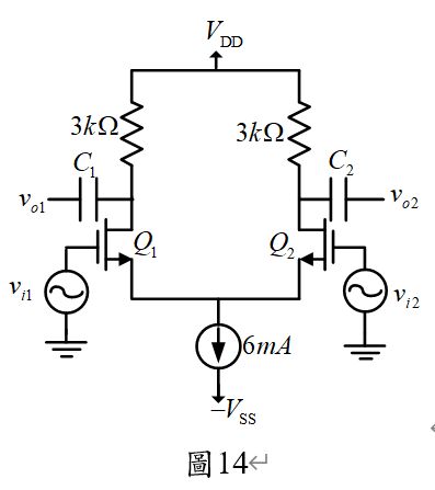 49.圖14所示電路中,若Q1與Q2的參數,則此電路之電壓增益應為多少? (A)-24 (B)24 (C)-18 (D)18。